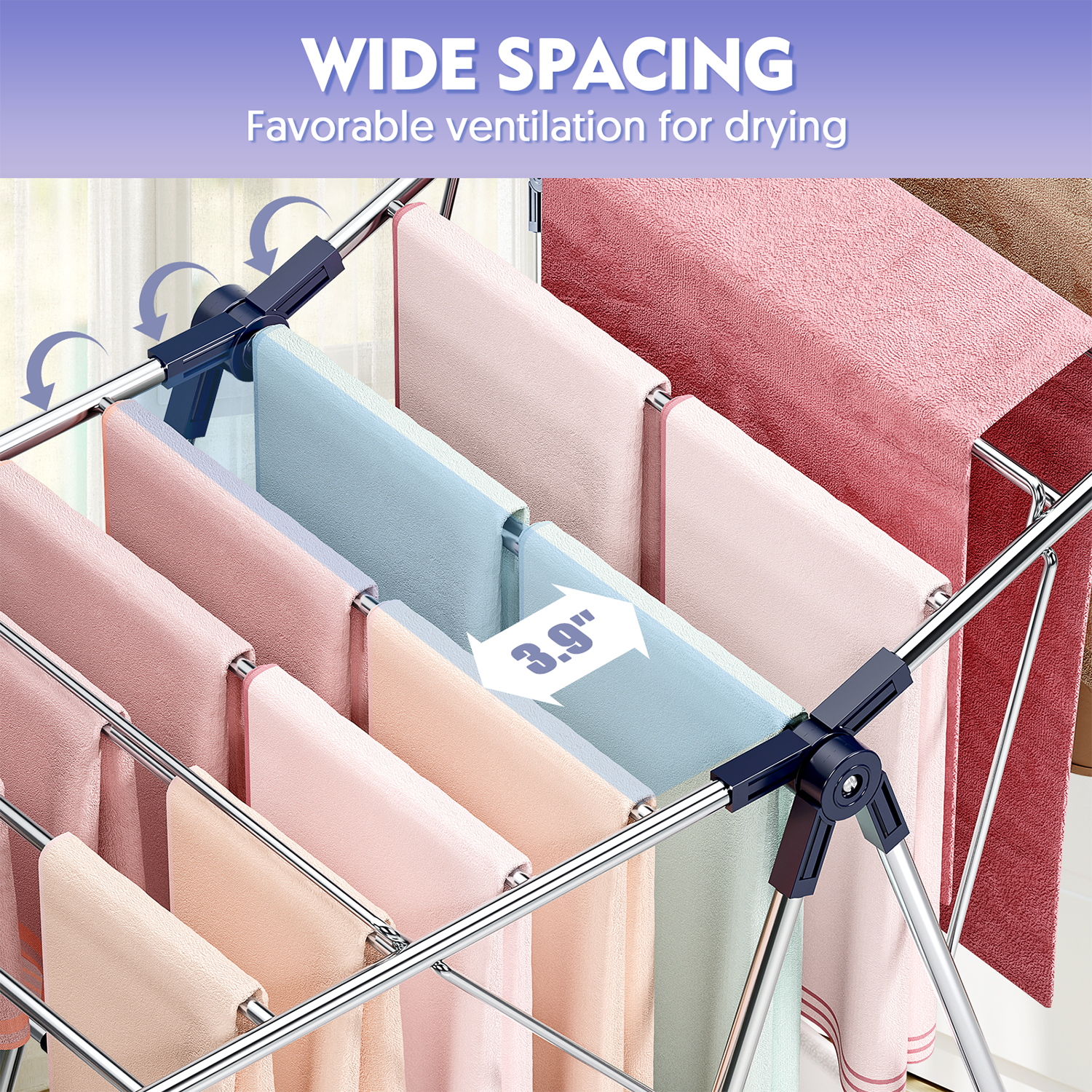 2. The laundry drying rack has two wings that can be easily adjusted in height to accommodate various lengths of laundry. The gap between the drying rods is 3.9 inches and helps clothes dry quickly.
