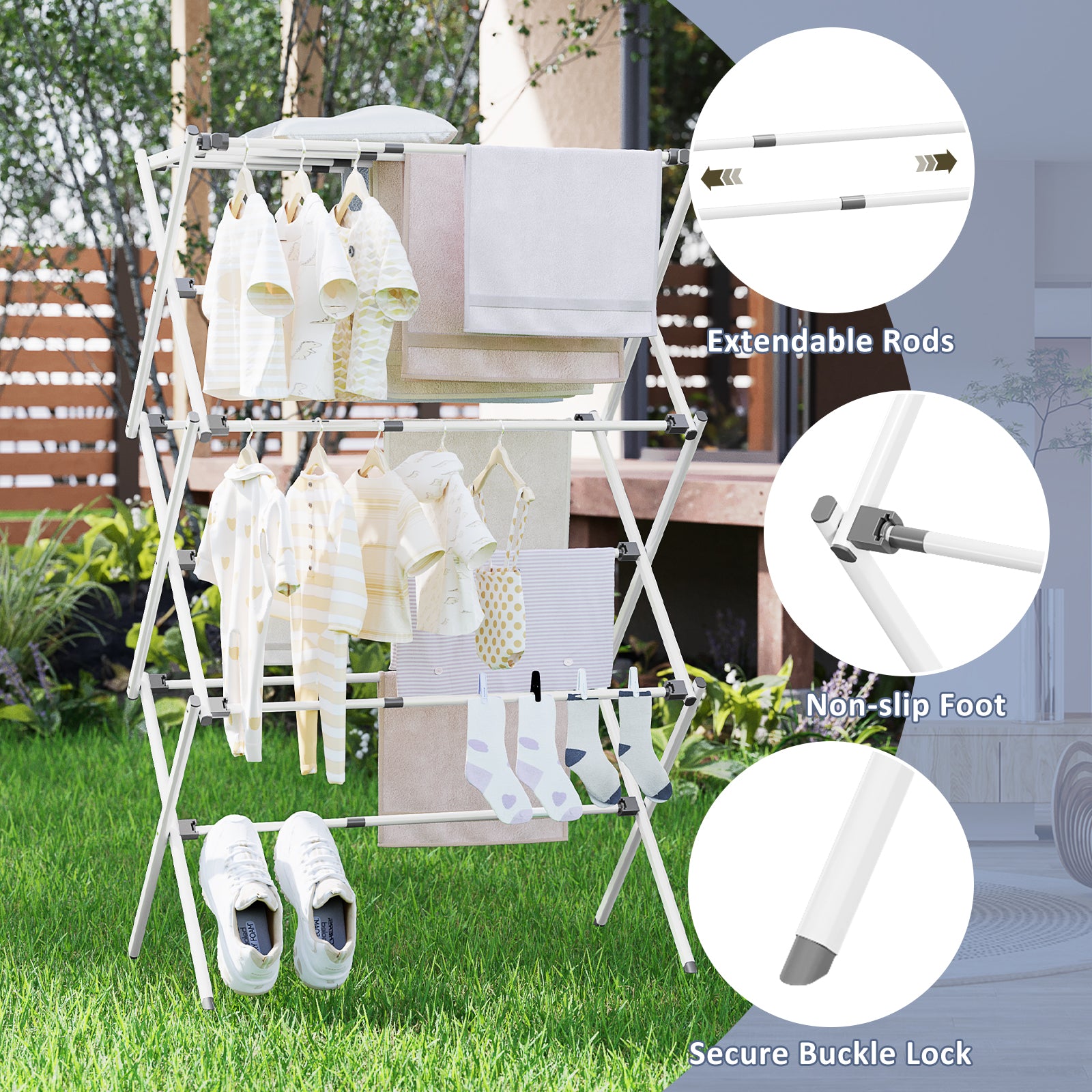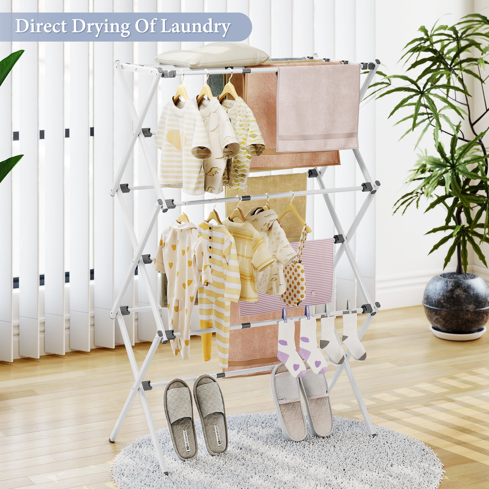 Kingrack's new generation of clothes drying rack in home helps you improve the quality of your life. This drying rack is a three-layer foldable drying rack developed by a new generation. This drying rack is ready to use after opening. Tool-free installation design keeps you away from installation troubles. It can be opened and used, folded at any time, and can be stored in wardrobes, gaps, under the bed, etc., so that you no longer worry about taking up space. It is very friendly to single people, renters, students, apartments and other small-sized people. The foldable design allows you to move easily. It is a good choice for indoor and outdoor, and camping. Use it in your laundry room or in your living room, balcony or patio. Come and bring it home and start a new life.